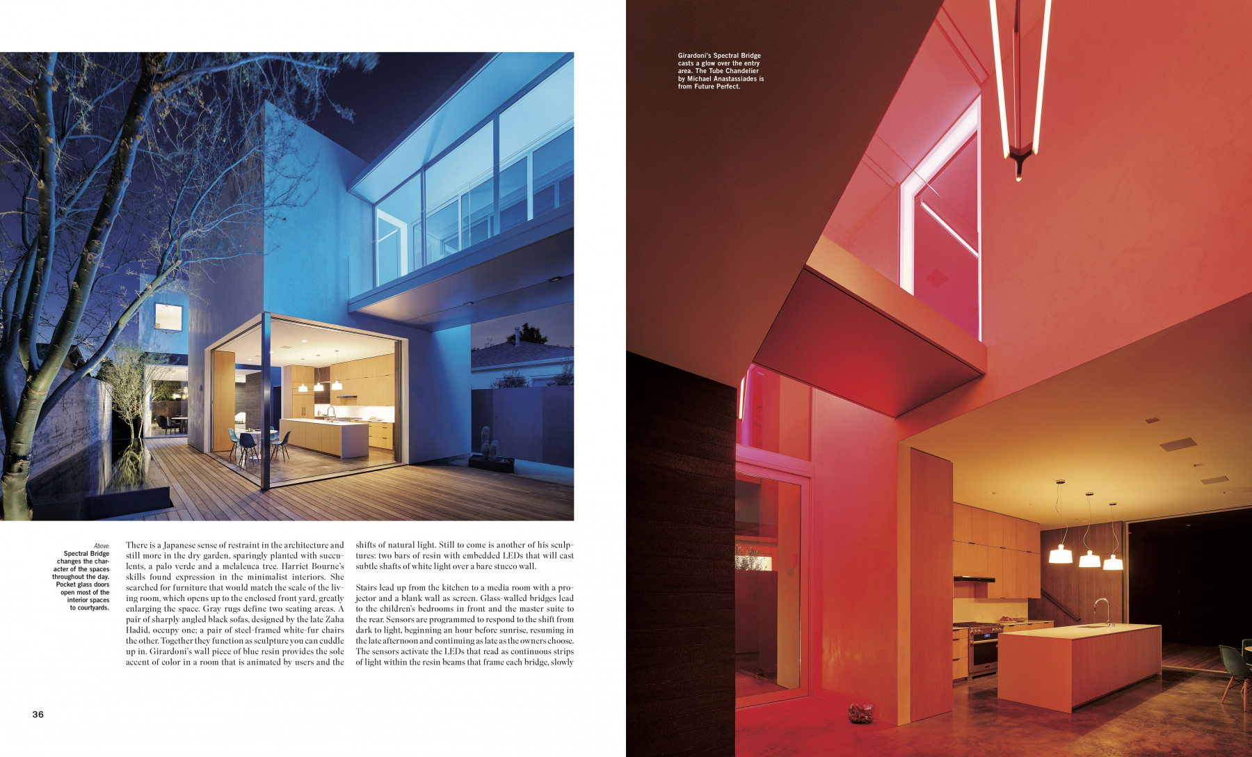 Stairs lead up from the kitchen to a media room with a projector and a blank wall as screen. Glass-walled bridges lead to the children’s bedrooms in front and the master suite to the rear. Sensors are programmed to respond to the shift from dark to light, beginning an hour before sunrise, resuming in the late afternoon and continuing as late as the owners choose. The sensors activate the LEDs that read as continuous strips of light within the resin beams that frame each bridge, slowly changing from white to a variety of hues. Sitting in the spectral lounge you are immersed in a cloud of colored light as though you had strayed into an installation by Dan Flavin or Turrell. “I wanted to create a site where the boundaries between art and architecture dissolve,” Girardoni explains. “It’s seamless whole—a living environment in which the light of day and its absence at night gives way to an illumination in which the participants’ experience continuously expands and contracts.”