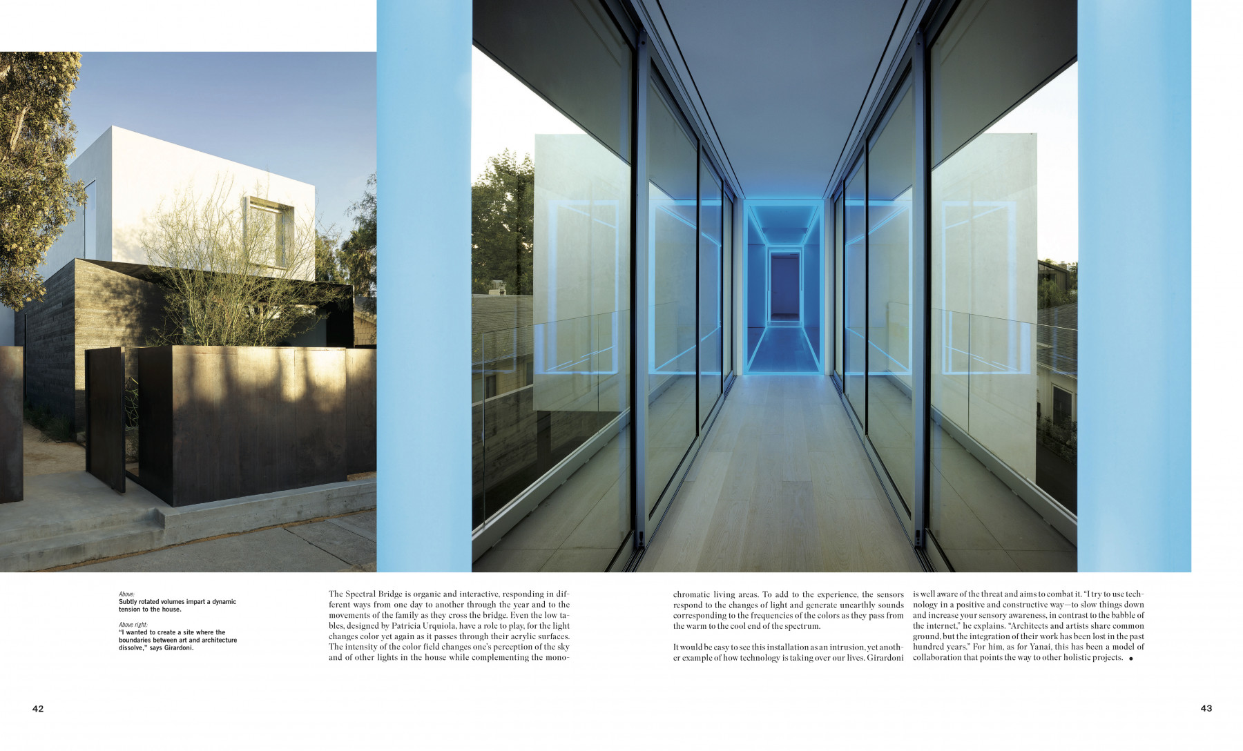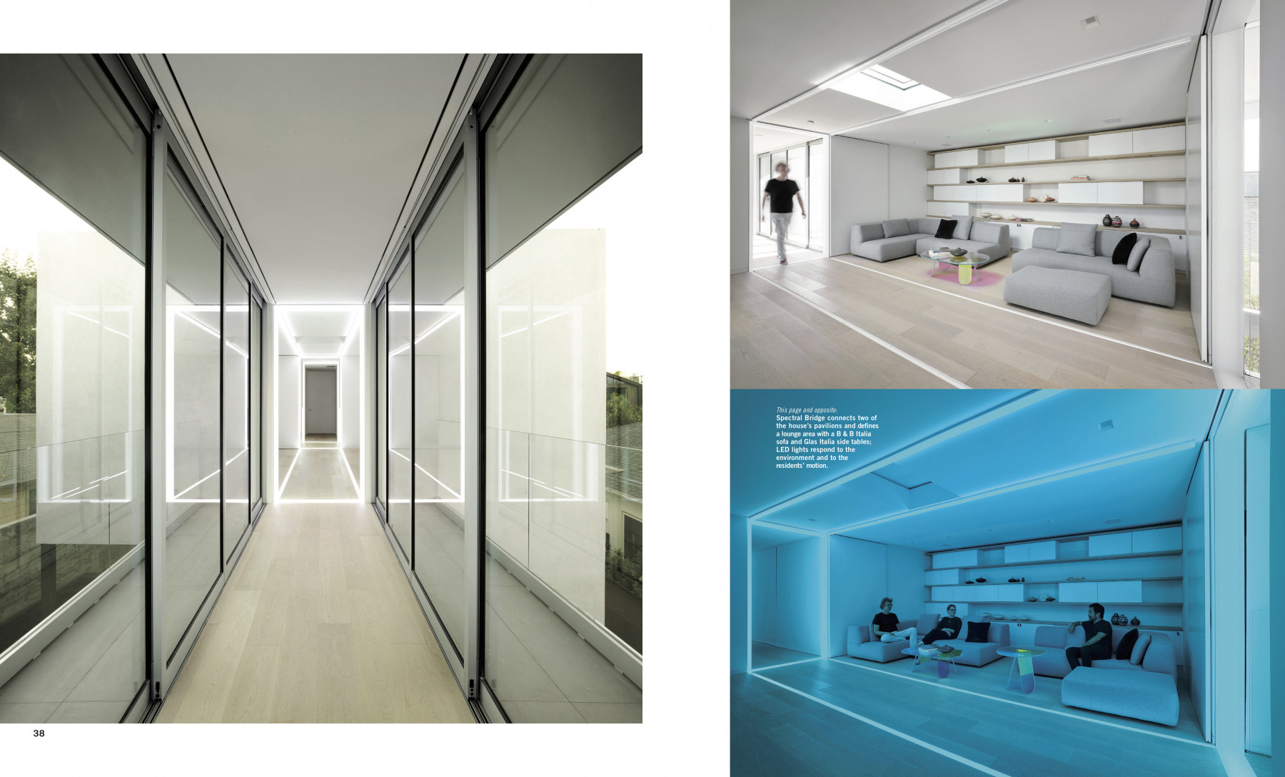 The Spectral Bridge is organic and interactive, responding in different ways from one day to another through the year and to the movements of the family as they cross the bridge. Even the low tables, designed by Patricia Urquiola, have a role to play, for the light changes color yet again as it passes through their acrylic surfaces. The intensity of the color field changes one’s perception of the sky and of other lights in the house while complementing the monochromatic living areas. To add to the experience, the sensors respond to the changes of light and generate unearthly sounds corresponding to the frequencies of the colors as they pass from the warm to the cool end of the spectrum.
