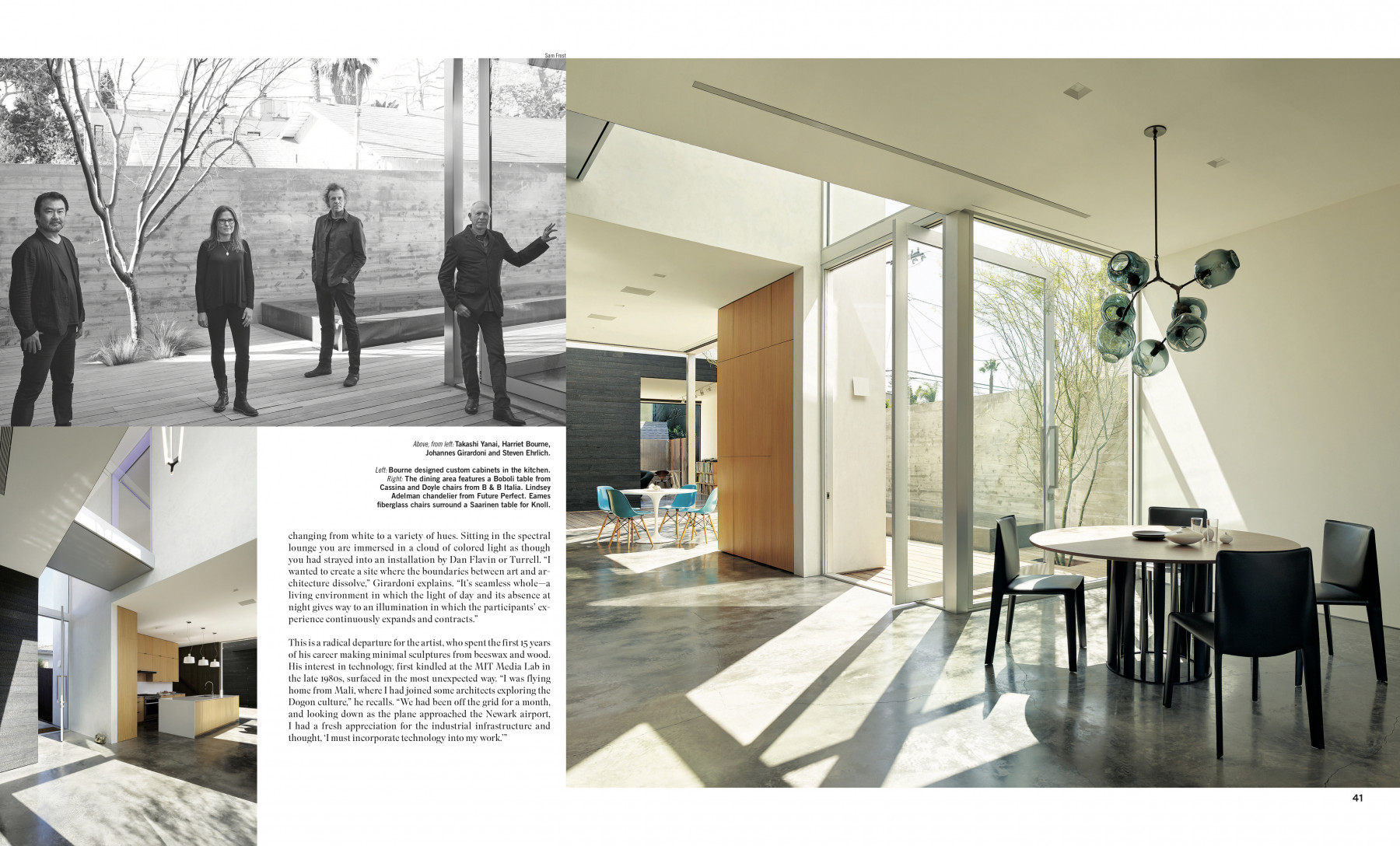 Girardoni grew up in Vienna, where he absorbed the irregularities and organic character of the city, moved to New York and relocated to Los Angeles seven years ago. “As an artist you have to take risks, but in New York you can’t afford to fail, so it inhibits creativity,” he says. “The top artists there form an impenetrable club; here they are much more accessible, along with fabricators. My practice has evolved in ways it never would have had I stayed back East.” The Light and Space movement initiated by L.A. artists in the 1960s was a point of departure as Girardoni began working with light and resin. “James Turrell and Robert Irwin opened up art to the idea of how we form our own reality,” he explains. “In their work we experience ourselves sensing. Olafur Eliasson has also explored the boundaries of perception.” Giradoni—recipient of the 2019 Francis J. Greenburger Award — did a major installation at the Venice Biennale in 2011, and he created “The Infinite Room,” a top-lit steel ellipsoid, as an integral element of a house architect Tom Kundig designed in Washington State.